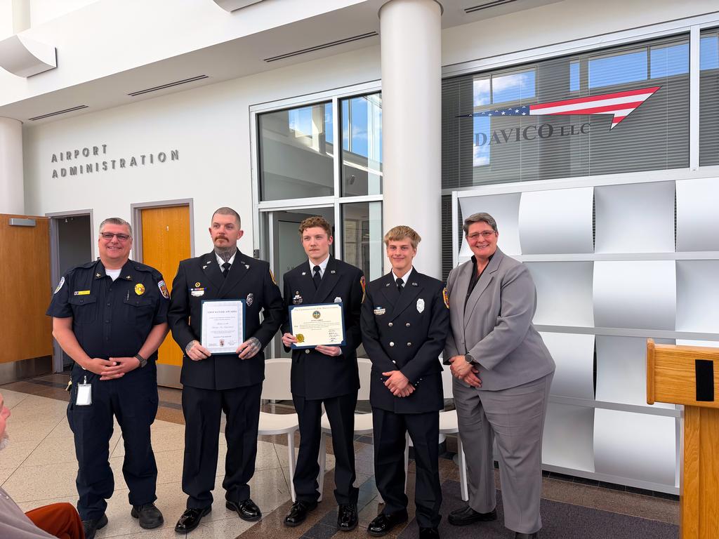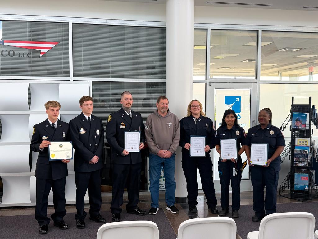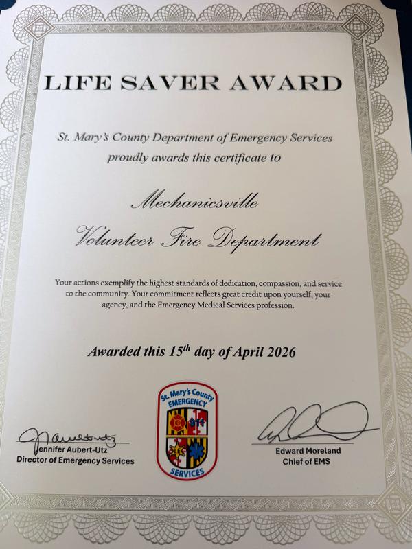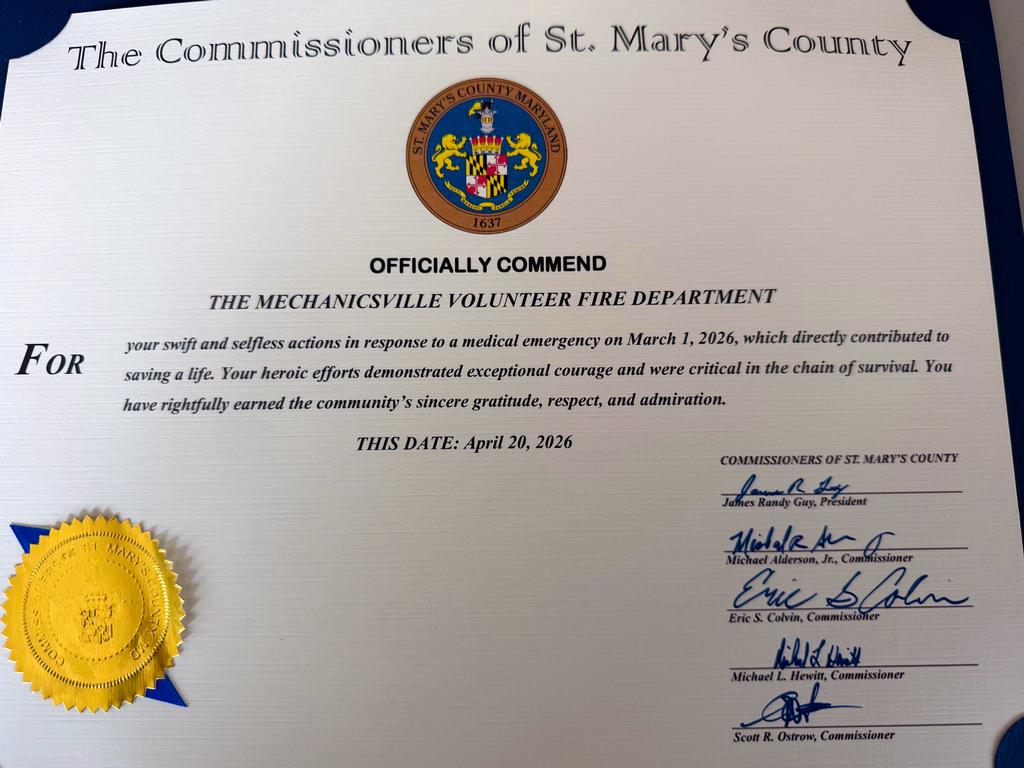 ​Today (Monday, April 20, 2026) at the St. Mary’s County Airport Terminal, members of the Mechanicsville VFD, along with several St. Mary’s County Department of Emergency Services EMS personnel, were recognized for their lifesaving efforts performed on a patient on March 1, 2026.